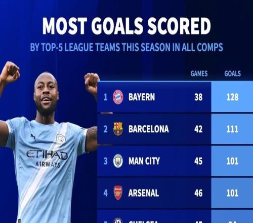 本赛季五大联赛球队进球榜:拜仁128球第1,巴萨第2,曼城第3