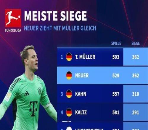 第362场胜利!诺伊尔追平由穆勒保持的德甲最多胜场纪录