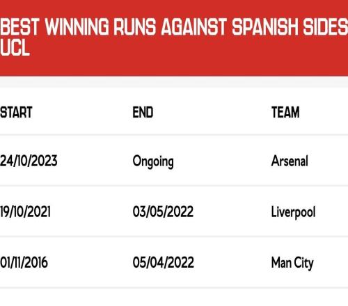 雷速体育10月20报道 阿森纳俱乐部官网晒出的数据显示,过去6次面对西甲球队,阿森纳保持全胜,面对西班牙联赛球...
