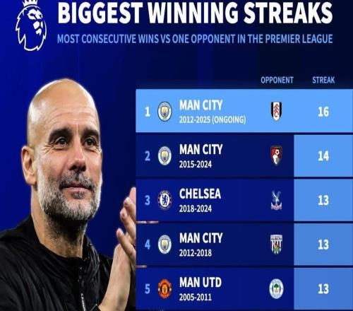德国转会市场网站列出了英超历史对阵同一球队最长连胜排行榜,曼城对富勒姆16连胜居首,排名第二的是曼城对伯恩...