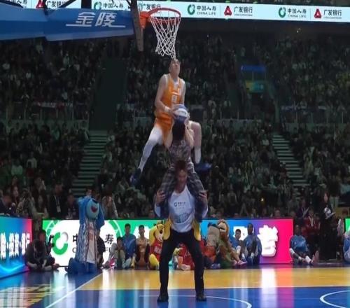 今天首先出场的是刘礼嘉(上海久事),他邀请到队友洛夫顿来协助扣篮,洛夫顿抛球打板后,刘礼嘉单手接球大风车扣篮,但...