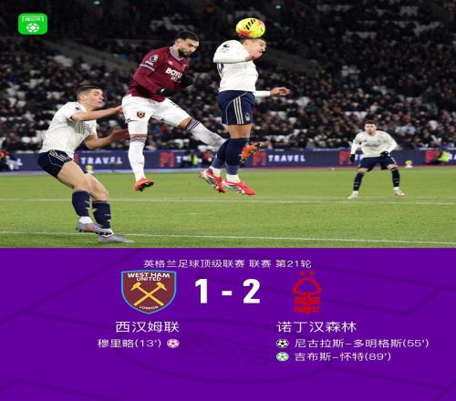 英超第21轮迎来一场保级大战,排名联赛倒数第3的西汉姆联主场迎战联赛倒数第4的诺丁汉森林。结果,西汉姆联主场...