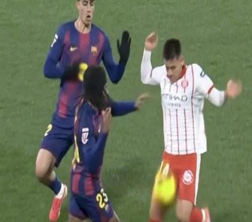 有争议,赫罗纳球员带球进攻踩踏孔德脚踝,进球后var无表示
