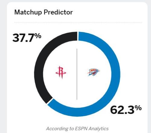 雷霆将坐镇主场迎战火箭,ESPN对这场比赛进行预测:雷霆获胜的概率是62.3%,火箭是37.7%。