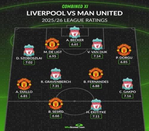 10月19报道 本轮英超将上演曼联与利物浦的焦点对决,数据网站Whoscored也盘点了两队球员本赛季英超场均评分最高阵容,具体如下: