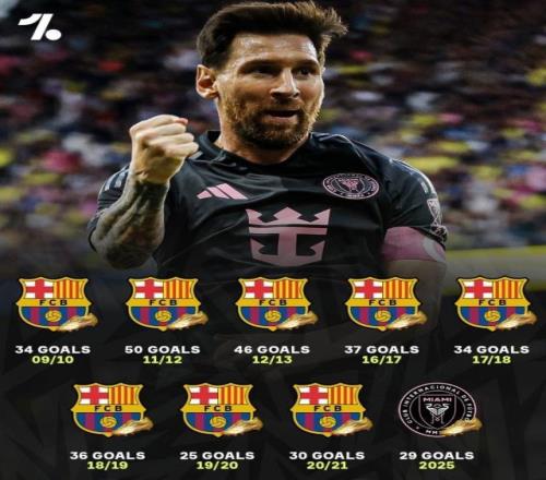 10月19报道 本赛季美职联常规赛全部结束,梅西以28场29球荣膺射手榜第一。据统计,这也是梅西生涯第9次获得联赛射手榜第一,此前8次均是在巴萨效力时期夺得西甲射手王