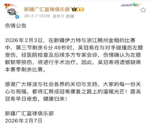 新疆男篮官方伤病公告写道:“2026年2月3日,在新疆男篮与浙江男篮的比赛中,第三节剩余6分49秒时,吴冠希在与对手碰撞后左膝受伤。经医院检查及后续多方专家会诊,伤情确认为左膝髌韧带损伤,将进行手术治疗,因此吴冠希将遗憾缺席本赛季剩余比赛。”