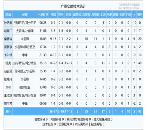 本场比赛,广厦队夺了97分,三个外援拿到了84分,其他球员一共拿了13分,其中,一个人拿了7分,其他三个人各拿了2分。