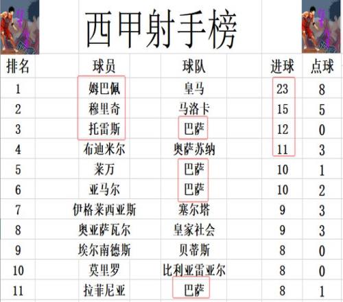 射手榜方面,姆巴佩补时打入一球后,23球继续稳居榜首,领先第2的穆里奇多达8球,比第2的托雷斯更是多了11球。莱万,亚马尔10球并列第5。拉菲尼亚,莫里罗和埃尔南德斯8球刚好挤入前十。