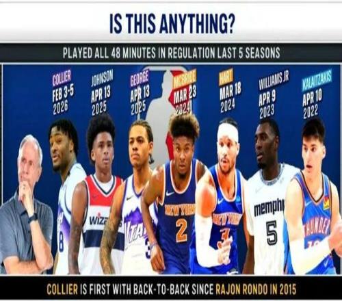 科利尔是继2015年的隆多后,NBA首个连续2场比赛无加时打满48分钟的球员!