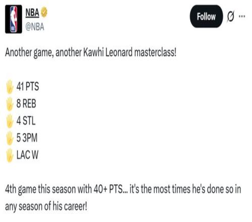 同时本场是小卡本赛季第4次单场轰下40+得分表现,同样创其个人生涯新高。