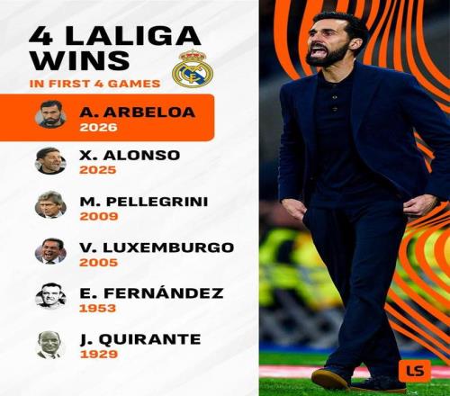 执教皇马前四场西甲全胜,阿韦洛亚成队史第六人