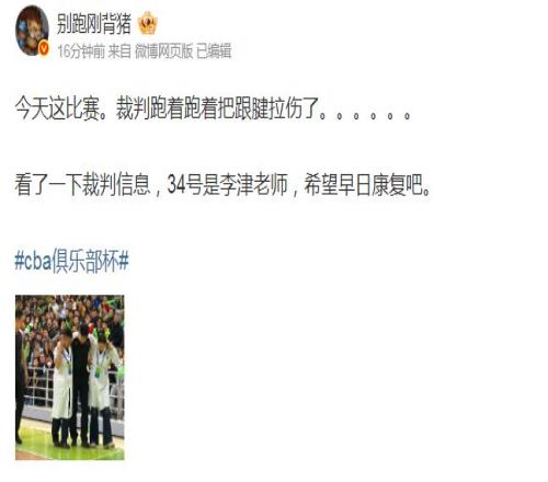 根据媒体人别跑刚背猪报道:“今天这比赛。裁判跑着跑着把跟腱拉伤了……看了一下裁判信息,34号是李津老师,希望早日康复吧!”