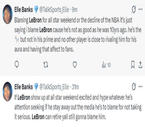 NBA记者Elle Banks写道:如果詹姆斯在全明星表现的兴奋且充满激情(不管是刻意追求流量还是出于真心热爱),那他都算正常发挥。但如果他故意避开媒体,就说明他没有用心对待全明星赛,那么他就要为此承担责任,就算勒布朗退役人们也会指责他。