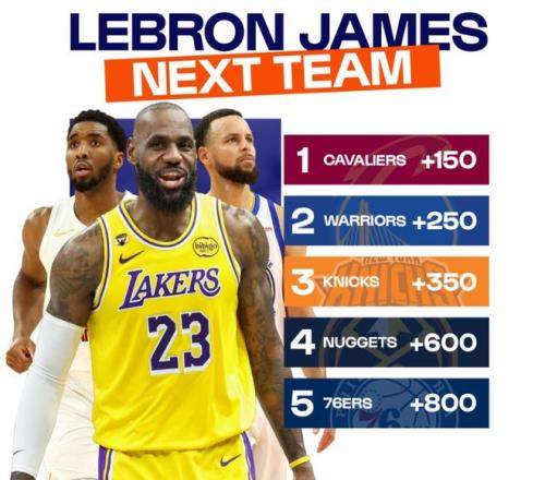 北京时间2月17日,湖人球星詹姆斯的最新下家赔率出炉,排在前五位的依次是骑士(+150)、勇士(+250)、尼克斯(+350)、掘金(+600)和76人(+800)。毫无疑问,骑士已经成为詹姆斯的头号热门下家。
