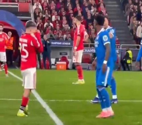 本菲卡官方在社交媒体上发布了如下视频,展示了维尼修斯疑似遭遇种族歧视的过程,并写道:“正如视频所示,考虑到球员间的距离,皇马球员不可能听到他们认为自己听到的内容。”