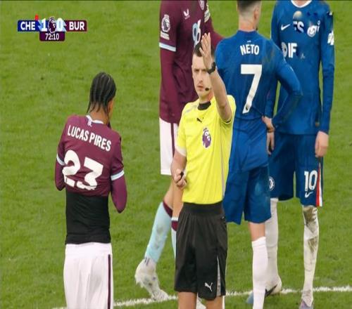 第72分钟,福法纳由于动作过大,吃到第二张黄牌,两黄变一红直接被罚下!随后,切尔西用托辛换下了多次浪费机会的帕尔默,保持防守体系的完整。球队的攻防形势瞬间反转,伯恩利成主动压制的一方。补时阶段的第3分钟,伯恩利角球罚到禁区,中路的弗勒明头球破门,1:1!切尔西最后时刻丢球。