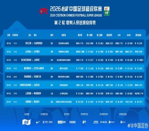 3月13日至15日,2026赛季中超联赛展开第2轮角逐。赛前,中国足协发布了本轮裁判人员选派安排表。