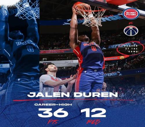 如今随着坎宁安无限期休战,活塞核心中锋杜伦将扛起重任,这位22岁猛男,本赛季至今场均出战27.8分钟就能贡献19分10.6板1.7助,投篮命中率64.2%高居联盟第三,同样在今年入选了全明星阵容。