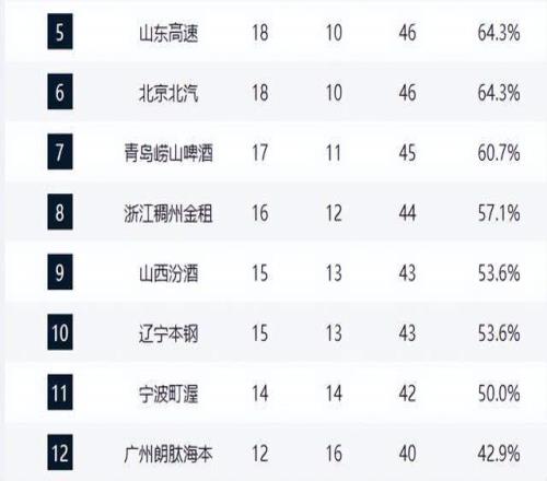 北京队与山东队同为18胜10负,分列第五、第六,下轮若双双取胜,极有可能联手反超广东,冲击前三。季后赛席位争夺进入白热化:青岛队17胜11负稳居第七,浙江队16胜12负位列第八,山西与辽宁同为15胜13负,虎视眈眈,前八席位悬念未解。